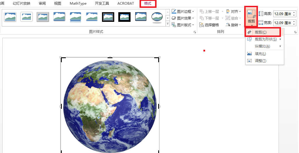 选中图片,单击“图片工具-格式”选项卡下、“大小”组中的“裁剪”下三角按钮,从弹出的下拉菜单选择“裁剪”选项,此时图片周围出现黑色小线框,拖动任意黑色短线即可裁剪图片。