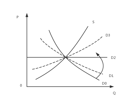 正常市场情况下,如图二所示,需求曲线是负斜率(D曲线),供给曲线是正斜率(S曲线),两者相交得到均衡价格。在经济学上,我们以水平线为准,如果总需求曲线是负斜率,那么市场机制起作用,均衡点存在的情况下政府不用过度干预,可是如果投机活动过于猖狂,如图三所示,需求曲线由D0开始变成D1,D2,D3,此时理论上可以论证,不存在均衡点,投入房地产市场的钱越多,投机活动越猖獗,越猖獗就越有人投机,投入的钱就越多,把房价一直推上去直至泡沫经济崩溃。所以,正斜率的需求曲线就代表泡沫经济。