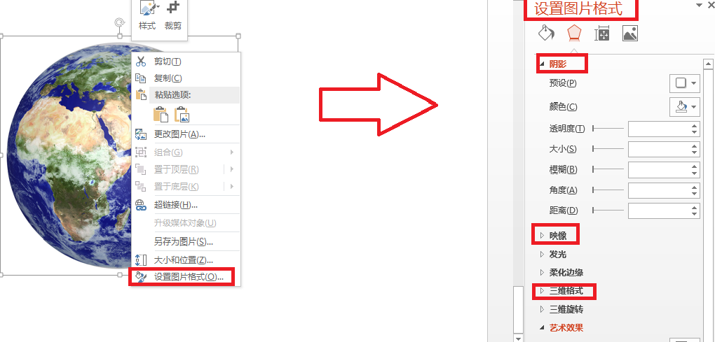如想为图片添加阴影,映像,三维格式的自定义效果,可在图片上单击鼠标右键,从弹出的下拉菜单中选择“设置图片格式”选项,通过分别单击“阴影”下三角按钮,“映像”下三角按钮,“三维格式”下三角按钮来设置相应效果的参数。