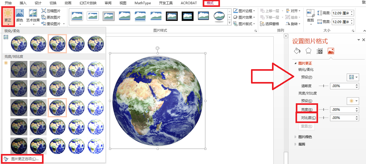 如改变图片的亮度和对比度,首先选中要更改的图片,单击“图片工具-格式”选项卡下、“调整”组中的“更正”按钮,在弹出的下拉菜单中选择“图片更正”选项,修改窗格中的亮度和对比度即可实现。
